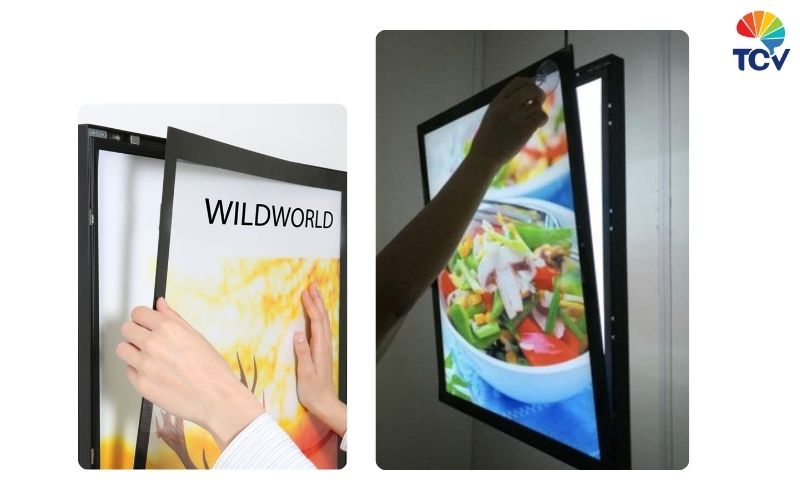 - Hộp đèn lightbox vải căng: Dùng vải in xuyên sáng, dễ thay nội dung, trọng lượng nhẹ.